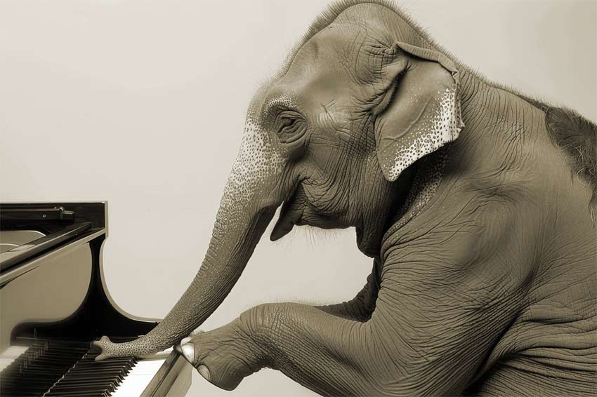 If Mozart’s starling was delicate, elephants at the piano are anything but.